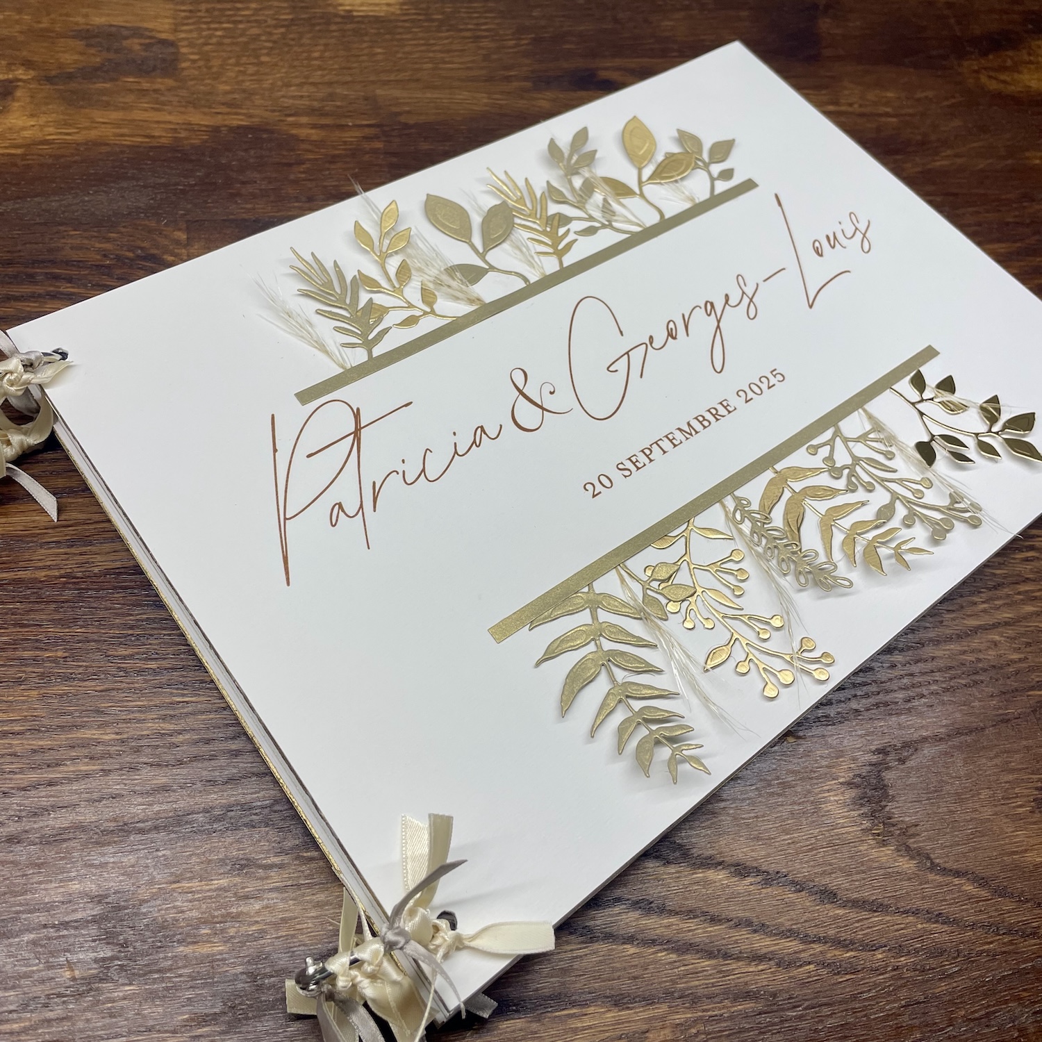 livre d'or pour mariage avec fleurs et feuillage découpé et collés en relief sur une couverture rigide